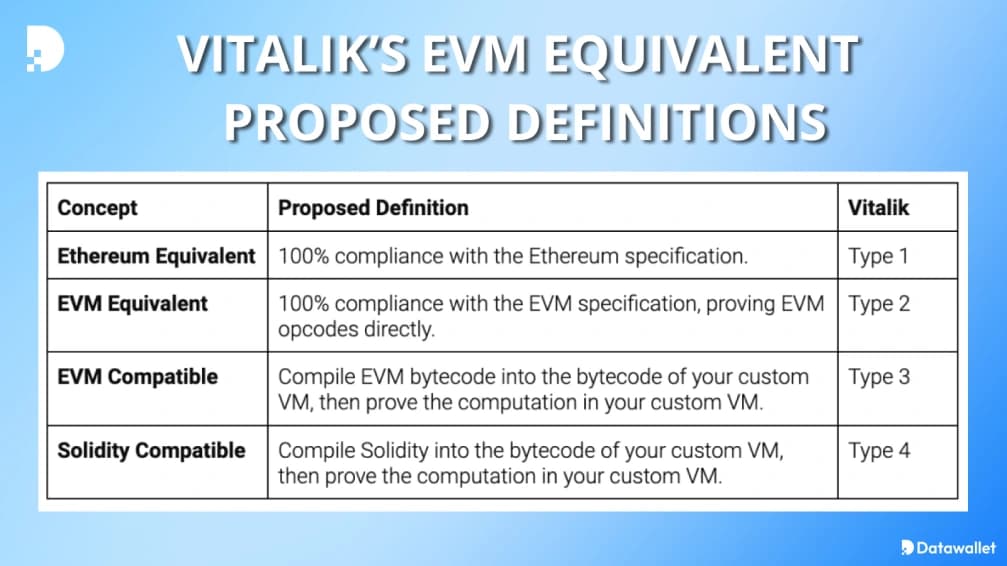 El tipo 1 alcanza la equivalencia total, pero adolece de una generación lenta de pruebas, mientras que los tipos 2 y 2.5 mejoran la eficiencia ajustando las estructuras de datos o gas .