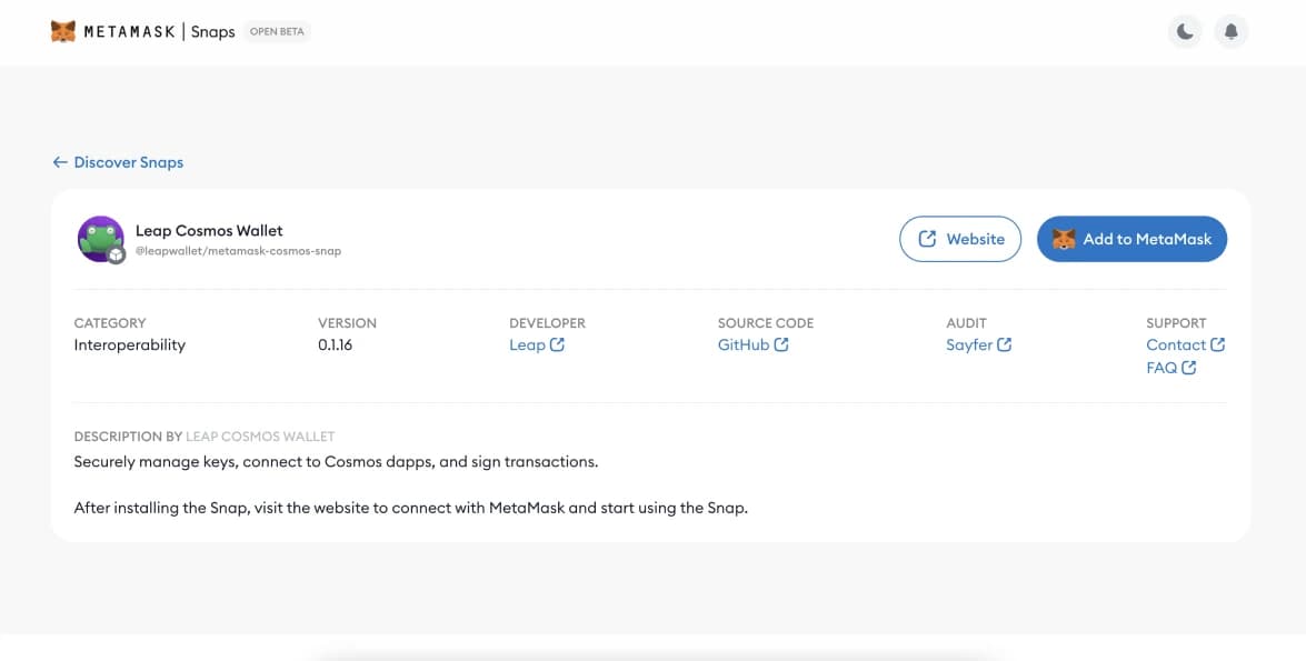 - انتقل إلى MetaMask Snaps: افتح MetaMask إلى صفحة Leap Cosmos Wallet .