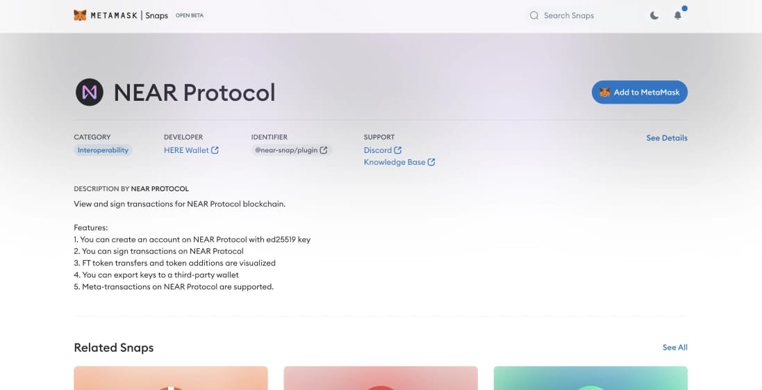 By adding a NEAR Snap, you can access NEAR's unique features, interact with NEAR-based decentralized applications (dApps), and manage NEAR tokens. This integration showcases MetaMask's support for a decentralized internet and innovations across multiple blockchain networks beyond Ethereum.