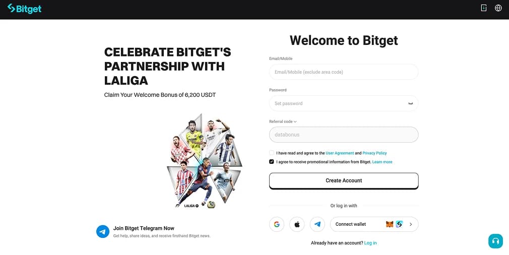 The direct signup link at bonus.bitget.com/databonus auto-fills the code so there's nothing to type.