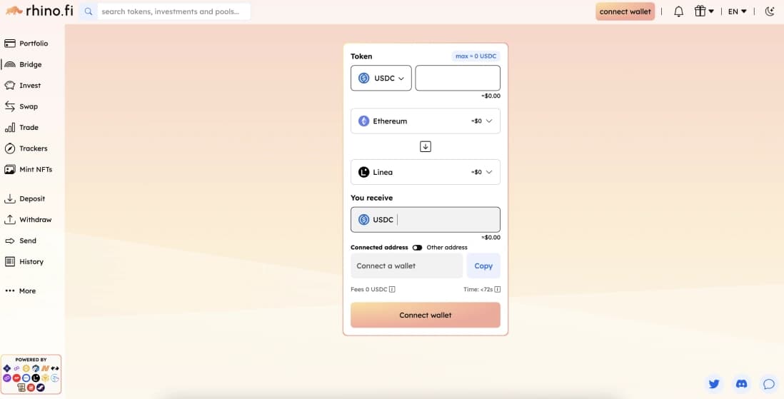 Bridging assets to the Linea Network is quick and easy using Rhino.fi, which supports over 17 EVM-compatible networks, including popular tokens like ETH, USDT, DAI, USDC and more. With over $2 billion in transfers handled, Rhino.fi is a reliable option for moving digital assets.