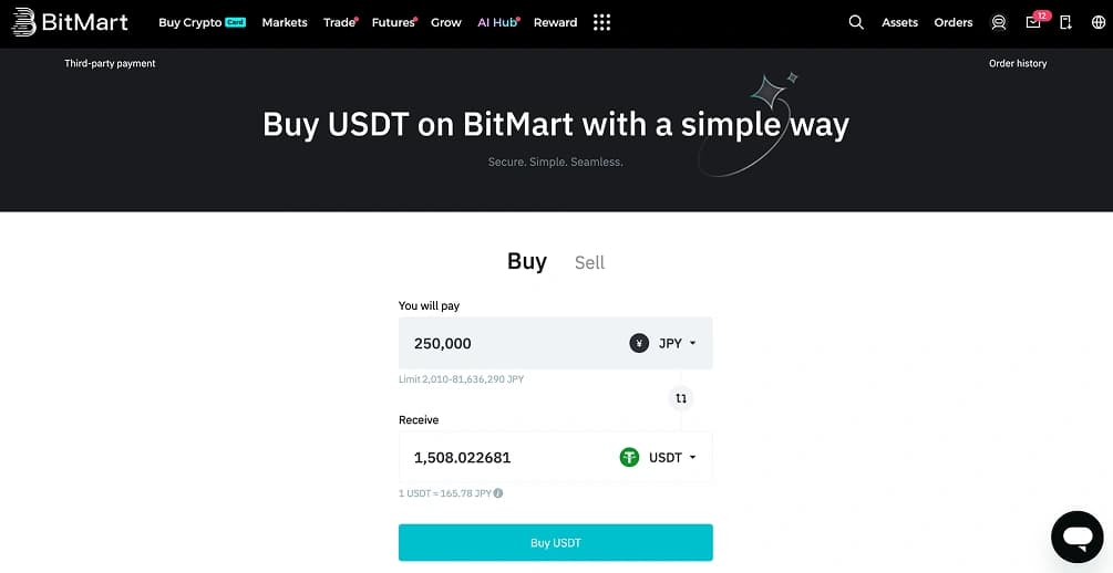 - Open Buy & Sell: From the BitMart homepage, click Buy & Sell. Select USDT as the asset and JPY as the currency, enter your amount, and choose LegendTrading as the service provider.