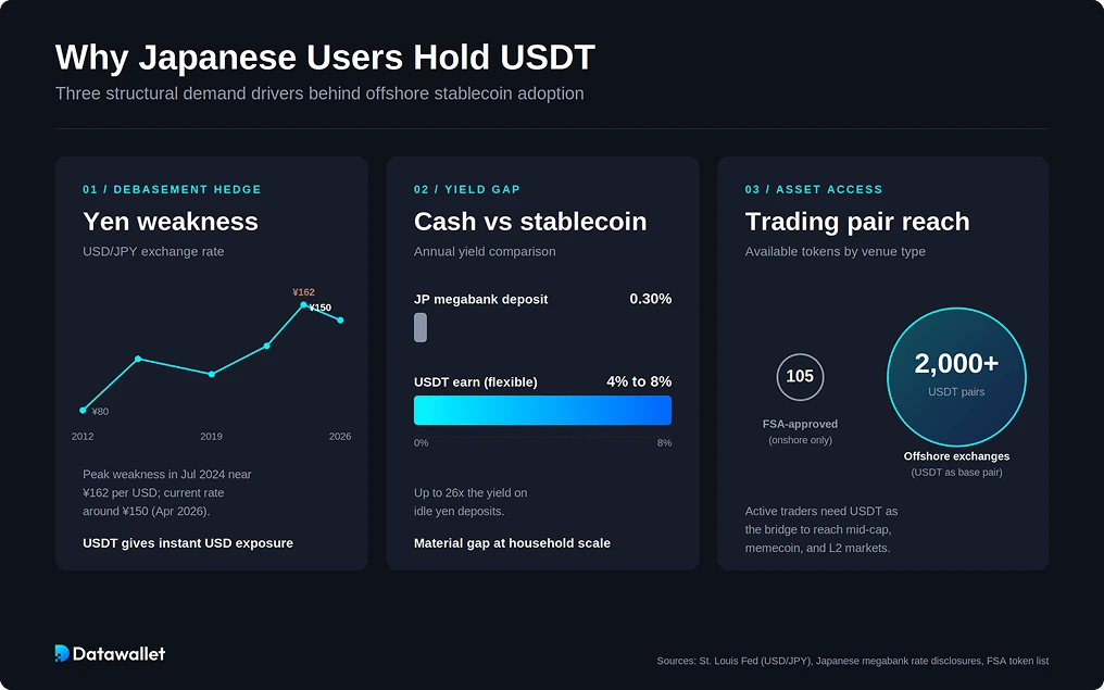 USDT demand in Japan runs differently from Southeast Asia or Latin America. The yen is a G7 currency with deep convertibility, so the remittance use case is weaker. Demand instead tracks three specific conditions: