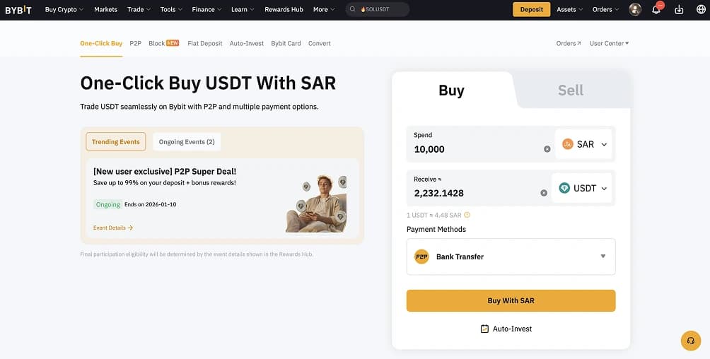 Saudi investors can buy Tether (USDT) through Bybit, a global exchange known for deep liquidity on SAR-to-USDT pairs. Bybit is available in Saudi Arabia and supports quick deposits in Saudi Riyals (SAR), making it easy to fund accounts and withdraw earnings.