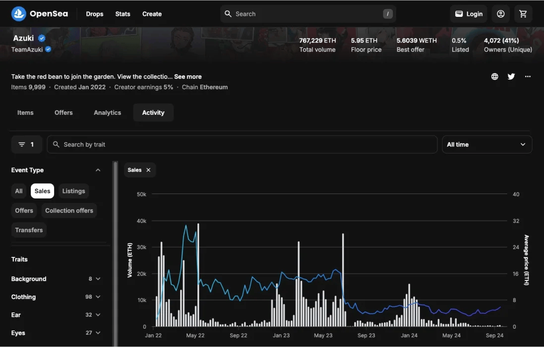 As of 2024, the floor price for Azuki NFTs is currently 5.95 ETH, down from its peak of 30 ETH. Before the release of the Elementals collection, the floor price was holding steady at 16 ETH, but the new collection, which drew criticism for its similarity to the original Azukis, caused some market turbulence and dropped the price to 5.75 ETH.