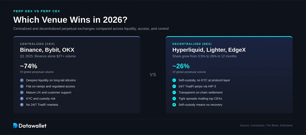 Die dezentrale Seite hat die Lücke schneller geschlossen, als die meisten Analysten vorhergesagt hatten.DEX stieg im vergangenen Jahr von 3,5 % auf über 26 %, angetrieben durch die Ausführungsqualität Hyperliquid,TradFi HIP-3 und das Scheitern mehrerer kleinerer zentralisierter Handelsplätze. Was maximale Liquidität bei den wichtigsten Kryptowährungen und Fiat-Einzahlungen angeht, haben die besten zentralisierten futures nach wie vor die Nase vorn. Für self-custody, rund um die Uhr verfügbaren TradFi und Engagement in der am schnellsten wachsenden Infrastruktur im Kryptobereich fließt ernsthaftes Kapital zunehmend in perp .