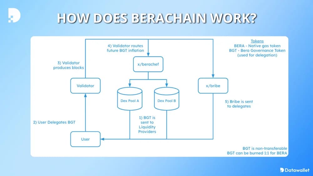- Drei-Token-Modell: Durch die Trennung des Governance-Tokens (BGT) vom gas (BERA) und der Stablecoin (HONEY) Berachain , dass Power-User, die hohe gas zahlen, ihre Governance-Befugnisse im Laufe der Zeit nicht verlieren. Dieses Modell schafft Anreize für eine aktive Beteiligung und führt zu einem sich selbst verstärkenden System, in dem Liquidität, Governance und Netzwerksicherheit miteinander verflochten sind.