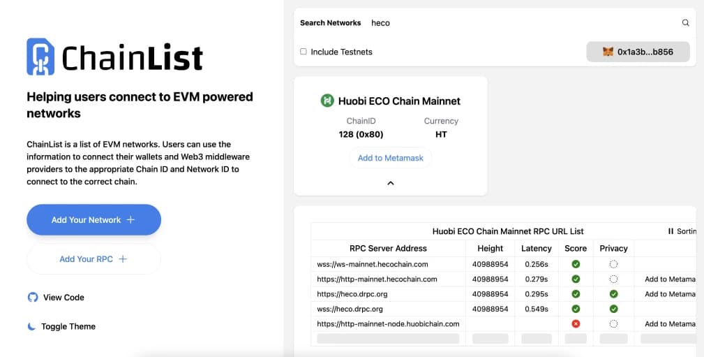 Uso ChainList, un agregador de redes fiable para cadenas EVM, para conectar fácilmente HECO a MetaMask. Comprueba siempre la configuración a través de fuentes oficiales para mayor seguridad.