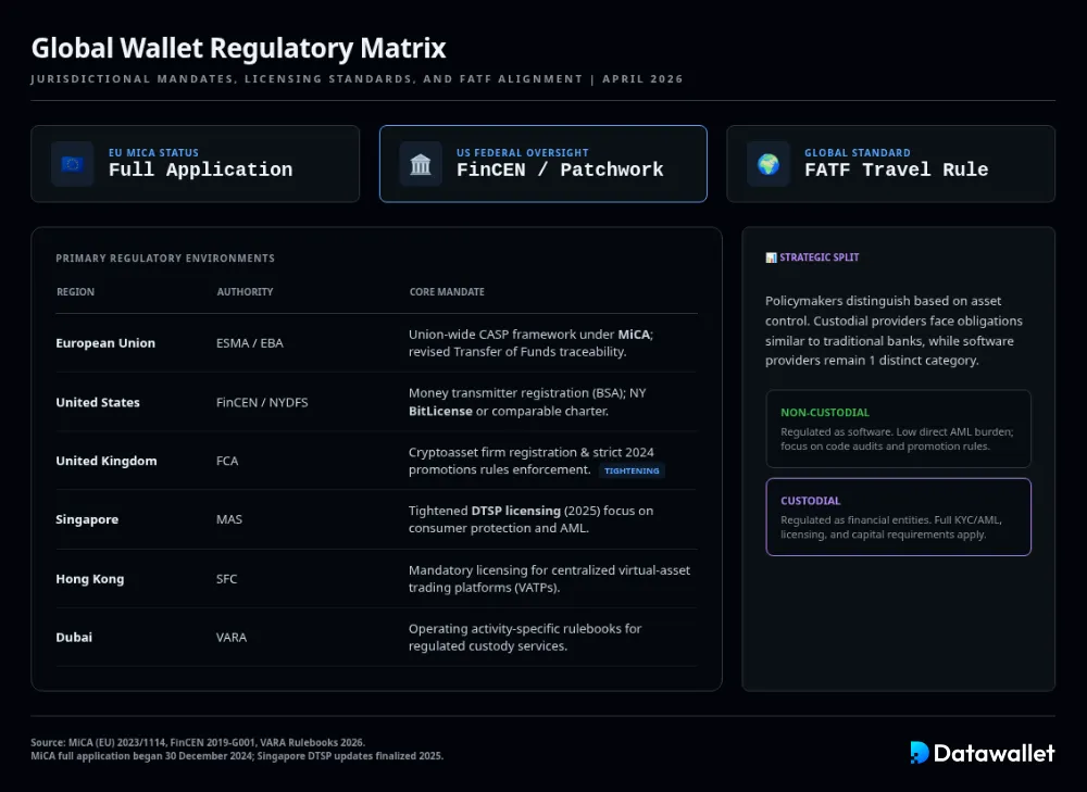 Las carteras de criptomonedas están reguladas de forma desigual, ya que los responsables políticos suelen distinguir entre el software que ayuda a los usuarios self-custody y las empresas que realmente custodian o transfieren los fondos de los clientes. En términos generales,wallet custodial se enfrentan a obligaciones mucho más estrictas en materia de licencias, AML, conducta y divulgación quewallet custodial .