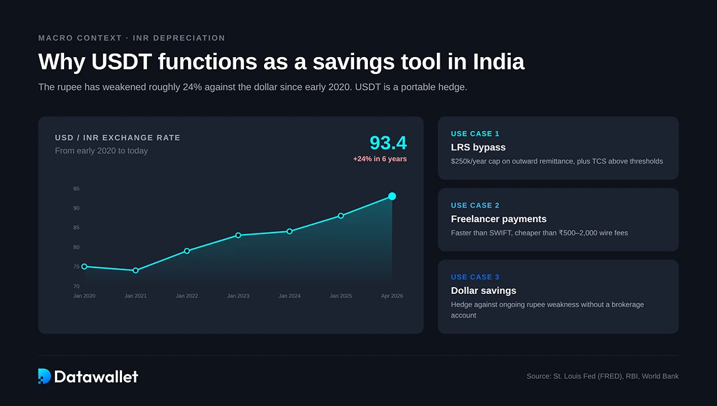 - Couverture contre la dépréciation de la roupie : depuis début 2020, INR dépréciée, passant d'environ 75 à plus de 93 par rapport au USD, atteignant de nouveaux plus bas historiques en mars 2026. Détenir une partie de son épargne en dollars américains est devenu un moyen pratique de se couvrir pour les Indiens de la classe moyenne, et USDT le moyen le plus simple d'y parvenir sans avoir besoin d'un compte de courtage. De nombreux utilisateurs avec lesquels je m'entretiens considèrent leur USDT moins comme une position de trading que comme un compte d'épargne en dollars.