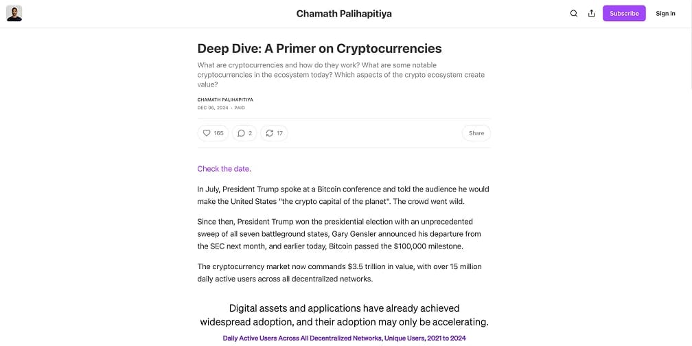 En décembre 2024, Chamath a publié un guide complet de 139 diapositives sur la cryptomonnaie via son Substack payant, offrant ainsi à ses lecteurs des conseils clairs pour distinguer les projets cryptographiques prometteurs du hype du marché. Il y a exposé les principes fondamentaux, expliquant pourquoi certains projets réussissent tandis que d'autres tombent dans l'oubli.