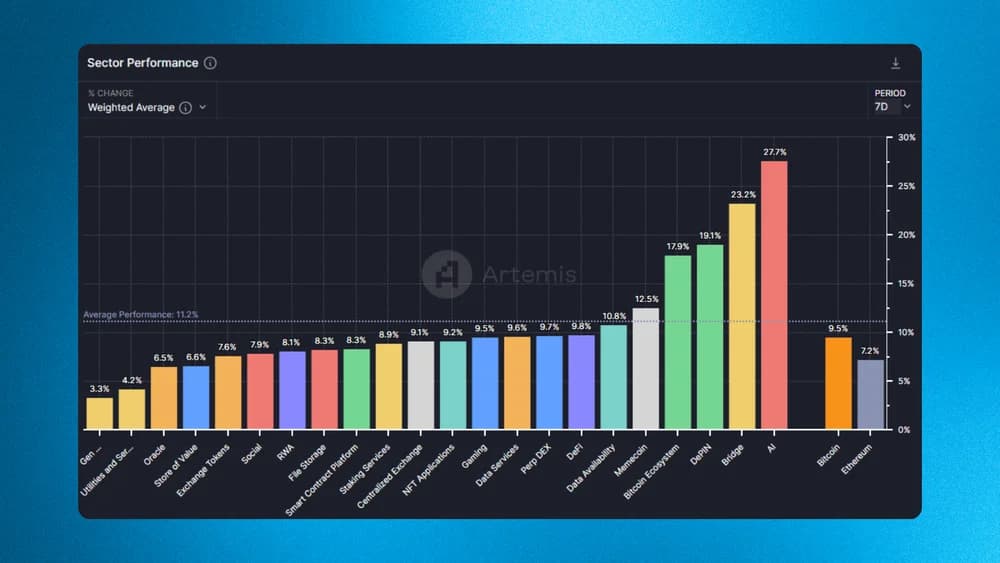 According to data from Artemis, the performance of various crypto sectors over a 7-day period highlights an average performance of 11.2%. The leading sector is AI, which has seen a remarkable increase of 27.7%, followed by the Bridge sector with a 23.2% gain and DePIN at 19.1%.