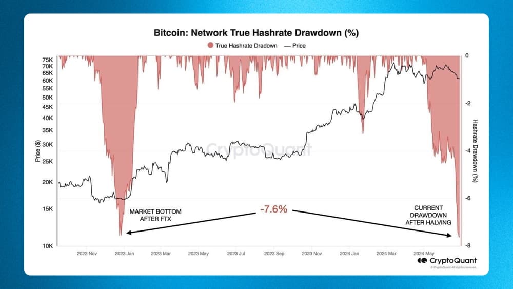 Data from CryptoQuant shows a 7.6% drop in Bitcoin mining hashrate this month, now resembling levels last seen during the FTX exchange collapse in December 2022. Unlike that period, today’s decline follows Bitcoin’s recent halving, cutting miner rewards to 3.125 BTC. Some users highlighted that in the FTX case, the hashrate level indicated the market's bottom at the time.